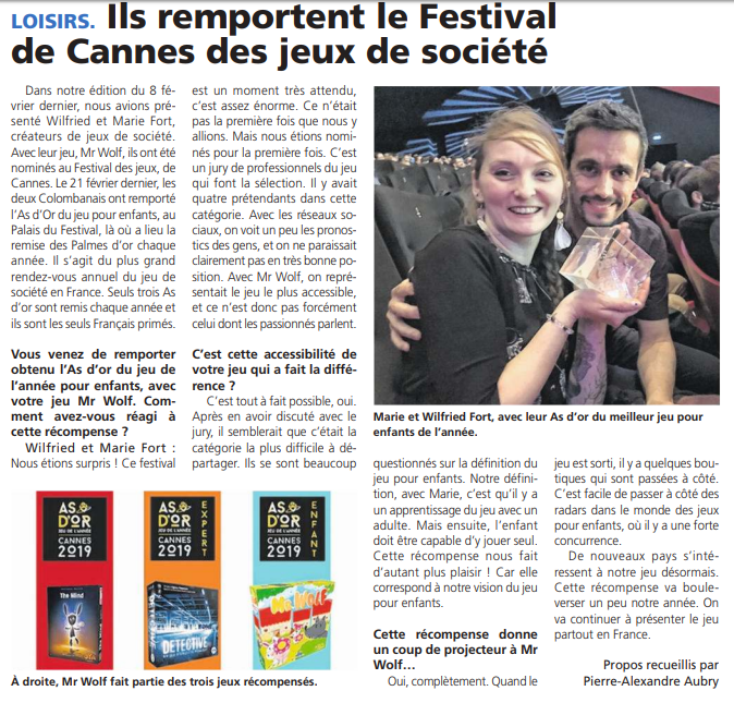 « Ils remportent le Festival de Cannes des Jeux de société » Voici l’article paru récemment dans …