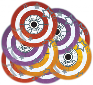 9 disques, 12 dés, 4 palets… Le matériel n’a pas changé mais a été complétement sublimé par le talent de Tony Rochon. Le jeu a évolué aussi par quelques ajustements de règles ainsi que par l’instauration de 3 variantes. « Targets » c’est donc un jeu d’ambiance, de pichenettes de dés où les nombreux rebondissements rythment les parties. Pour en savoir plus, la TTTV explipartie est disponible ici.