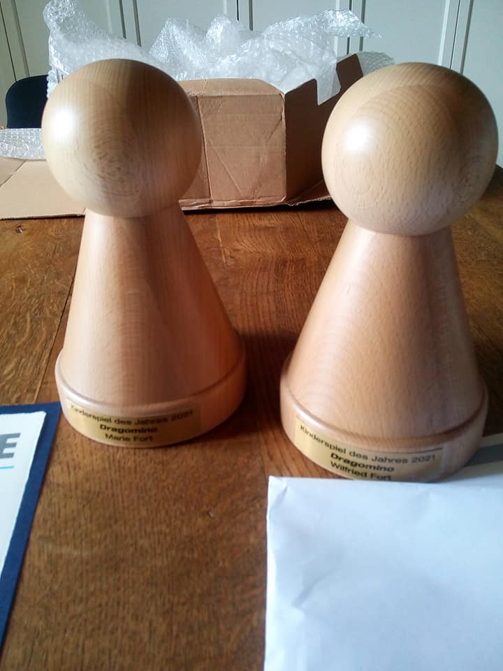 Quelques semaines après, nous recevions le magnifique trophée du Kinderspiel Des Jarhes (1 pour chacun d’entre nous !)