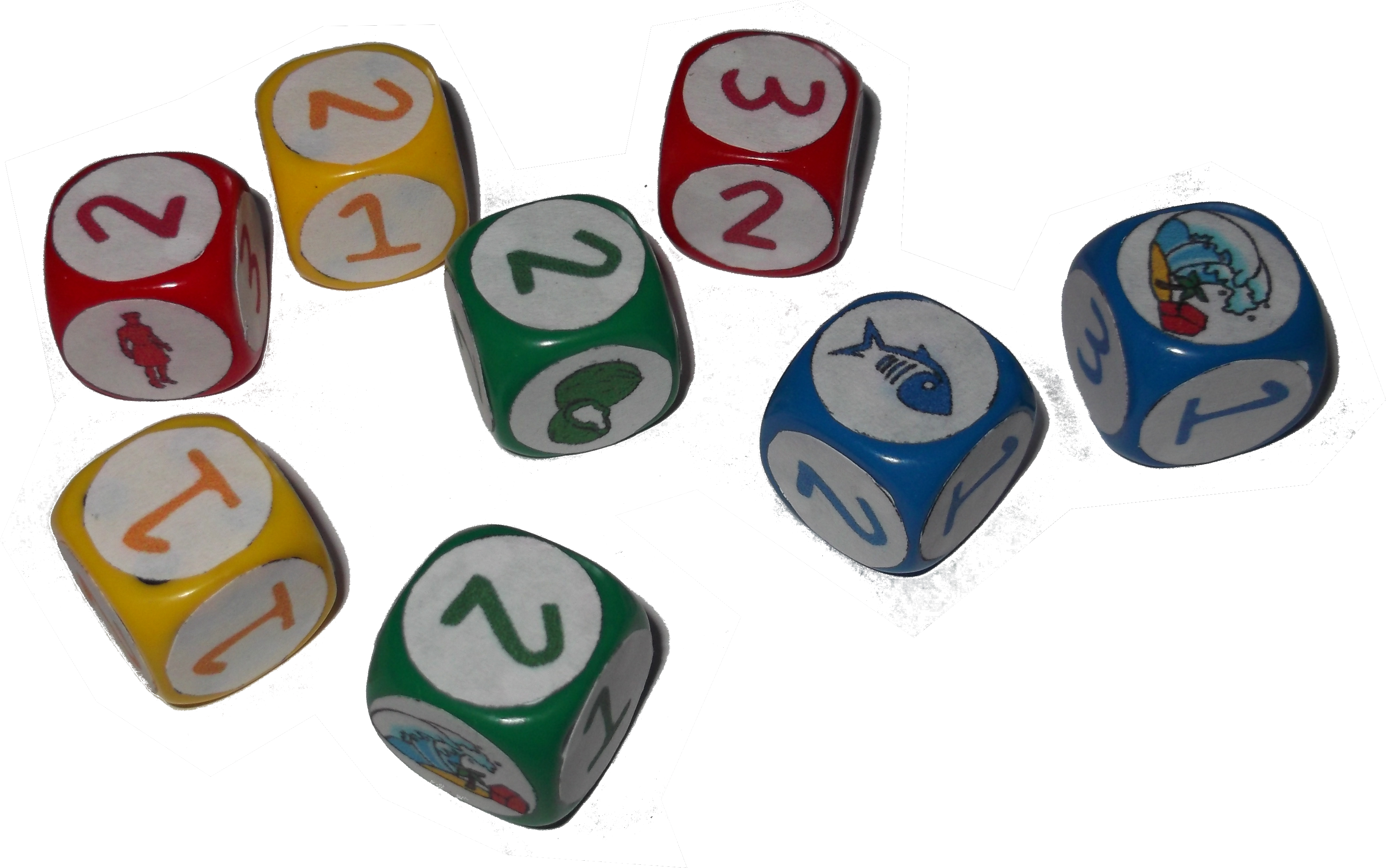 Descriptif : Vous devez développer devant vous des îles. Pour cela, le premier joueur va jeter les 8 dés et ensuite, chacun à son tour chaque joueur va prendre l’un des dés et la tuile correspondante. Un aménagement complet va vous permettre par la suite de récupérer des « richesses » (ex. une plage complétée pourra vous permettre de récupérer des coquillages). Gare aux tsunamis qui viendront détruire vos aménagements et endommager vos objectifs. Le premier joueur atteignant 10 points remportera la partie!