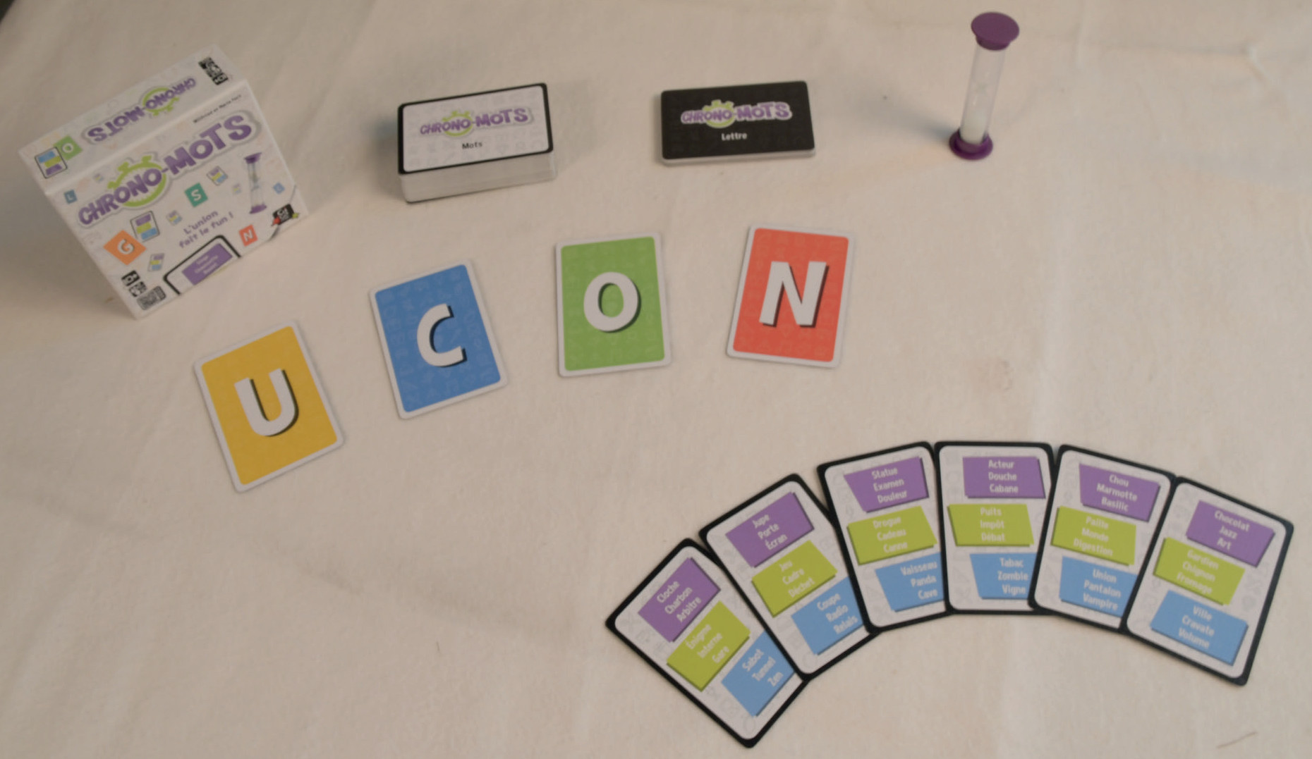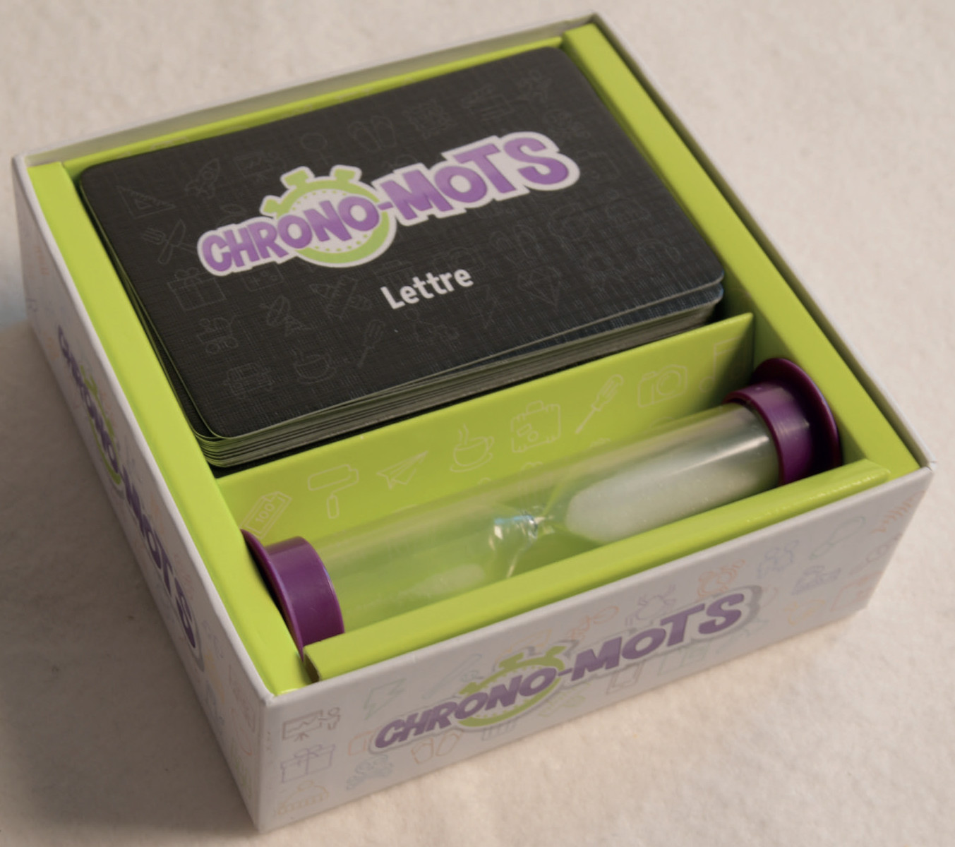 Chrono-Mots c’est un jeu coopératif où tour à tour, 2 joueurs se chargent de faire deviner un maximum de mots aux autres joueurs, le temps du sablier. Pour cela, ils devront donner des mots indices qui devront obligatoirement commencer par l’une des 4 lettres représentée sur les 4 cartes au centre de la table! Et si vous vous sentez très fort, essayez d’utiliser le moins possible de cartes lettre… la partie durera un peu plus longtemps et vous aurez ainsi plus de chance de faire un gros score!